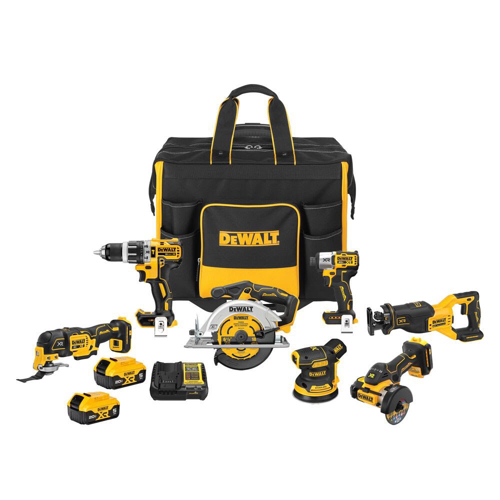 Expand your system with versatile 20V MAX* Brushless tools powered by innovation. The kit includes: DCD796 20V MAX* XR Cordless Lithium-Ion Compact Hammer Drill, DCF845 20V MAX* XR 3-Speed Impact 1/4 in. Driver, DCS356 20V MAX* XR Brshless 3-speed Oscillating Multi-Tool, DCS438 XR 3-in 20-volt Max Trigger Switch Brushless Cordless Angle Grinder, DCW210 20V MAX* XR Brushless VS Random Orbital Sander, DCS566 20V MAX* Brushless 6-1/2 in. Circular Saw, DCS382 20V MAX* XR Brushless Reciprocating Saw, two DCB205 20V MAX* XR 5Ah Batteries, and Charger. The kit also comes with Site-Readyâ„¢ Soft Storage bag.
